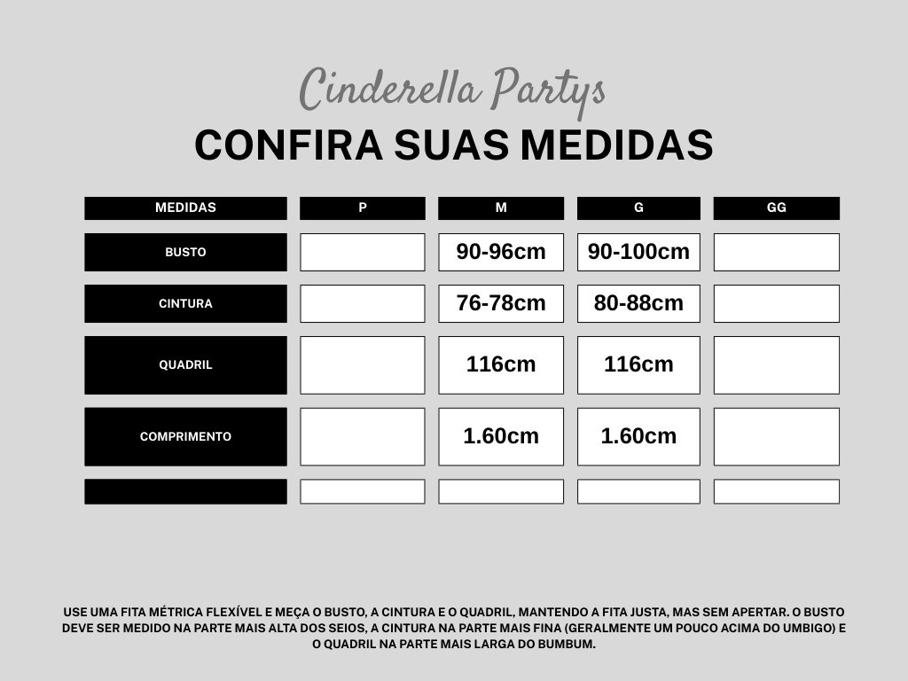 - Nos modelos com saia evasê, a medida do quadril pode não corresponder exatamente, pois o corte inclui tecido extra.