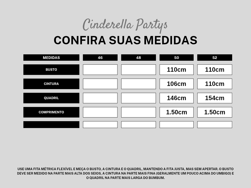 - Nos modelos com saia evasê, a medida do quadril pode não corresponder exatamente, pois o corte inclui tecido extra.