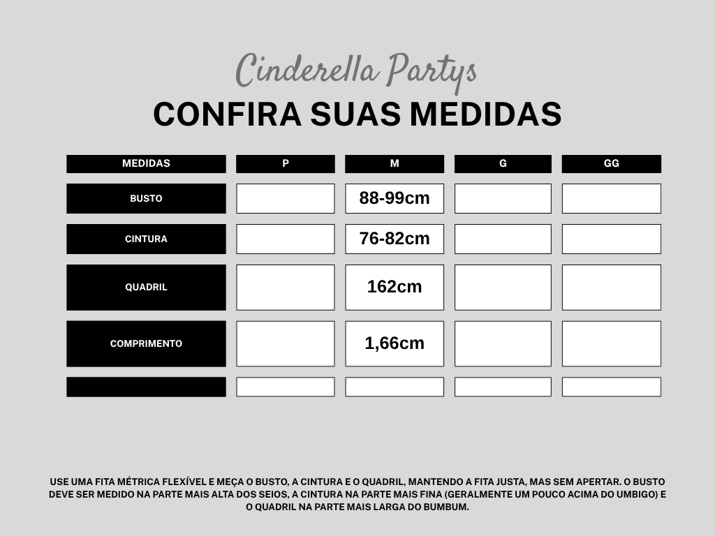 - Nos modelos com saia evasê, a medida do quadril pode não corresponder exatamente, pois o corte inclui tecido extra.